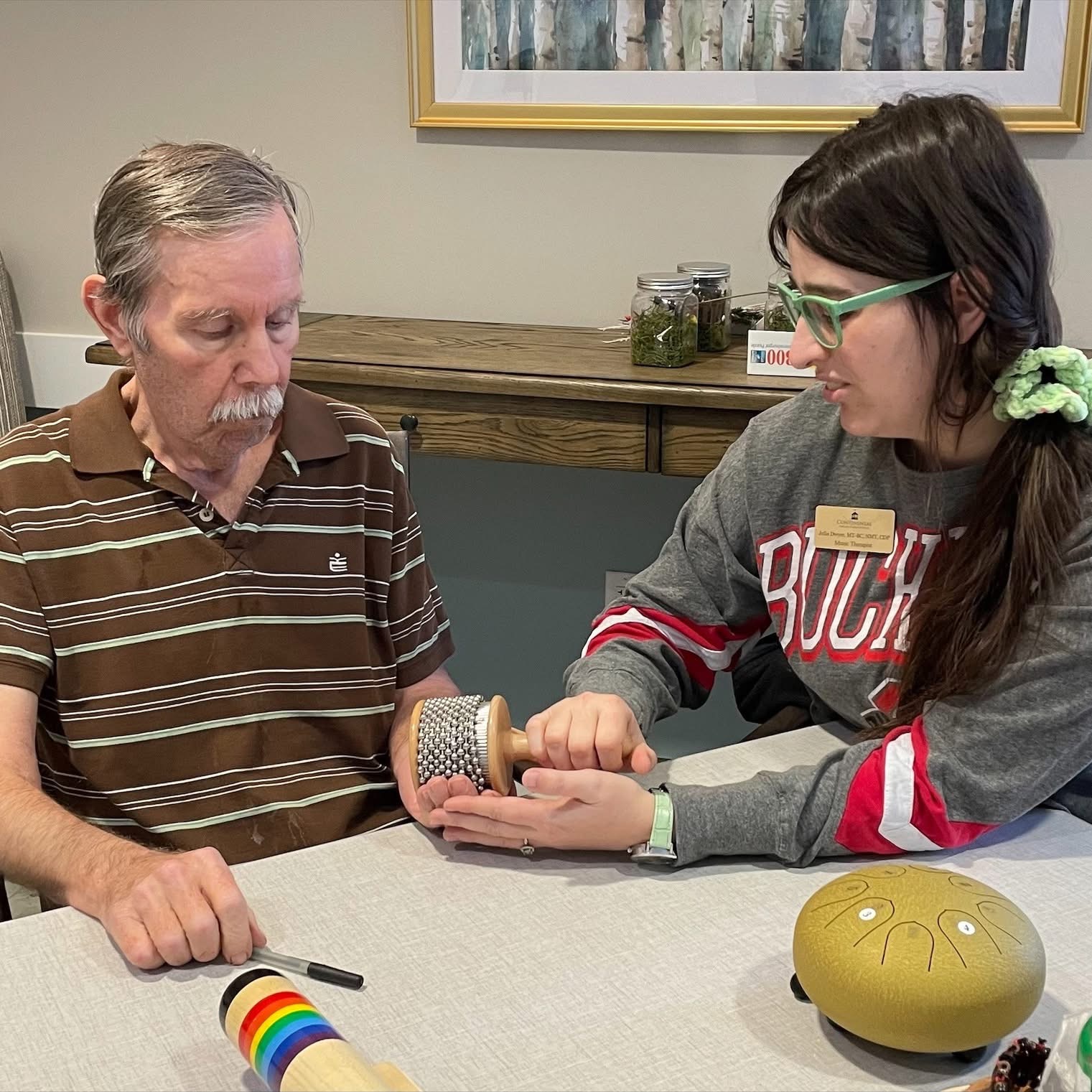 Julia’s role extends across both The Ganzhorn Suites and our sister community, Dublin Glenn Memory Care. While her expertise is shared, her sessions at Ganzhorn are customized to the residents here and respect each person’s musical history, cultural background, and clinical needs.
